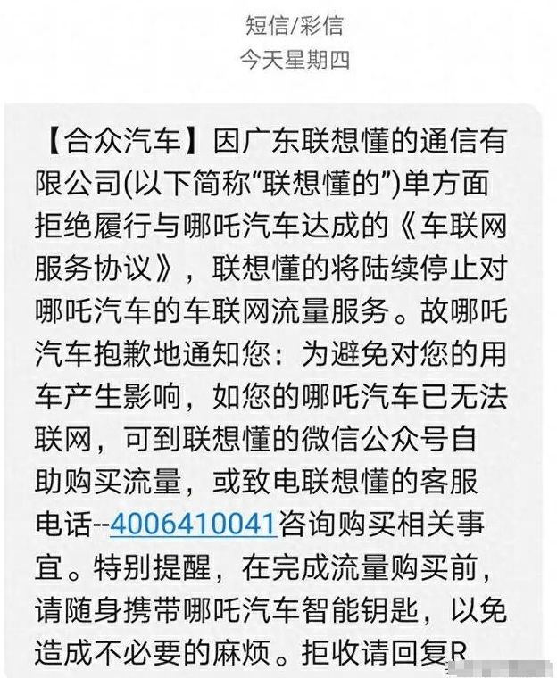“您的车已断网,请自助购买流量。”9月11日中午,无数哪吒车主同时收到这条来自合众汽车(哪吒母公司)的群发短信,一场大规模“断网风波”正式浮出水面。据通知显示,由于广东联想懂的通信有限公司单方面停止车联网服务,哪吒汽车无法继续提供免费流量。这意味着,近50万名车主若想恢复远程控车、开关空调、在线导航等基础功能,必须自掏腰包购买流量包。