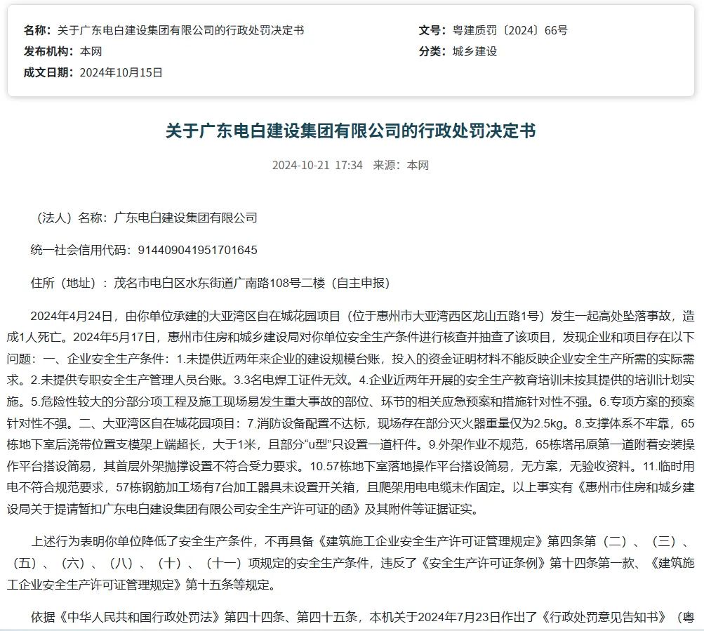 在事故发生将满半年之后,2024年10月15日,广东省住建厅发布《关于广东电白建设集团有限公司的行政处罚决定书》。处罚书指出,电白公司除了承建的大亚湾区自在城花园项目在同年4月24日发生高坠事故致一死外,还于同年5月17日,被惠州市住房和城乡建设局核查并抽查自在城花园项目中,发现企业和项目存在未提供近两年来企业的建设规模台账,未提供专职安全生产管理人员台账,3名电焊工证件无效,外架作业不规范,57栋钢筋加工场有7台加工器具未设置开关箱等共11个问题。于2024年10月21日至11月19日期间,暂扣电白公司建筑施工企业安全生产许可证30日的行政处罚。