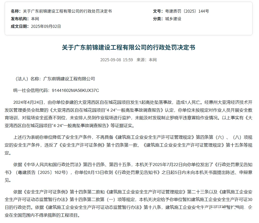 由广东前锦建设工程有限公司(以下简称前锦公司)参建的惠州市大亚湾西区自在城花园项目,在2024年4月24日发生1起高处坠落事故,造成1人死亡。由此,省住建厅依据《安全生产许可证条例》及相关规定和办法,给予前锦建设公司暂扣建筑施工企业安全生产许可证30日的行政处罚。在此期间,前锦建设在全国范围内不得承揽新的工程项目。