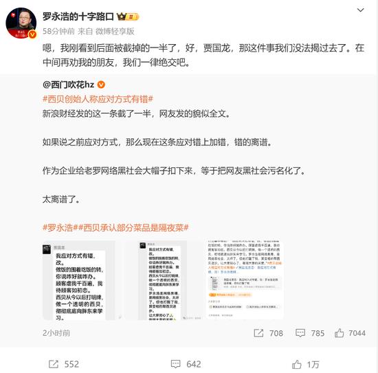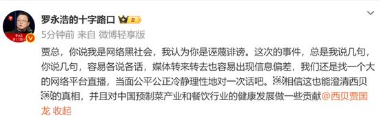 随后,罗永浩继续发文:这次的事件,总是我说几句,你说几句,容易各说各话,媒体转来转去也容易出现信息偏差,我们还是找一个大的网络平台直播,当面公平公正冷静理性地对一次话吧。相信这也能澄清西贝的真相,并且对中国预制菜产业和餐饮行业的健康发展做一些贡献。