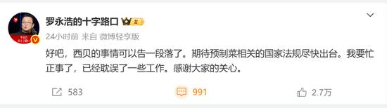 稍早前,罗永浩已经表态,宣布西贝预制菜事件告一段落。他期待预制菜相关的国家法规尽快出台,并表示“要忙正事了”。