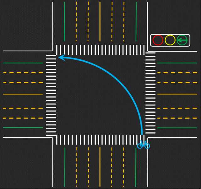 当左转弯信号灯单独亮起时,非机动车靠路口中心点的右侧,沿切线方向左转。注意要转大弯,不要与车辆抢行。