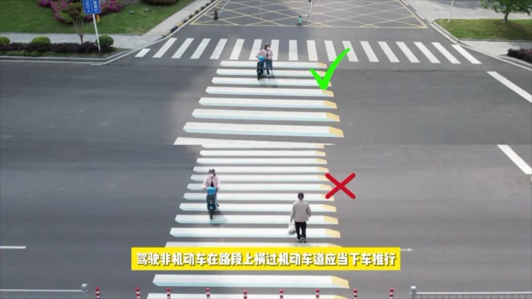 《中华人民共和国道路交通安全法实施条例》第七十条规定:驾驶自行车、电动自行车、三轮车在路段上横过机动车道,应当下车推行,有人行横道或者行人过街设施的,应当从人行横道或者行人过街设施通过;没有人行横道、没有行人过街设施或者不便使用行人过街设施的,在确认安全后直行通过。