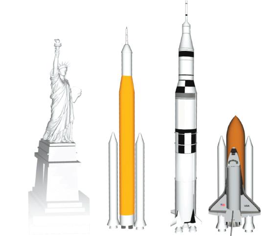 美媒发布的“太空发射系统”(SLS)载人版本与自由女神像(带底座)、“土星五号”火箭、航天飞机的高度对比图。