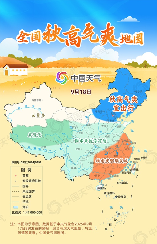 爽在体感舒适。进入秋季,副热带高压也逐渐减弱东退,暖湿气流减弱,空气变得干爽、暑热渐消。常年9月,东北大部、西北地区东部及新疆等地平均最高气温均在20℃至26℃之间,体感舒爽。除此之外,秋季我国冷空气活动虽然频繁,但总体强度比冬季弱,因此凉风习习,体感舒适。
