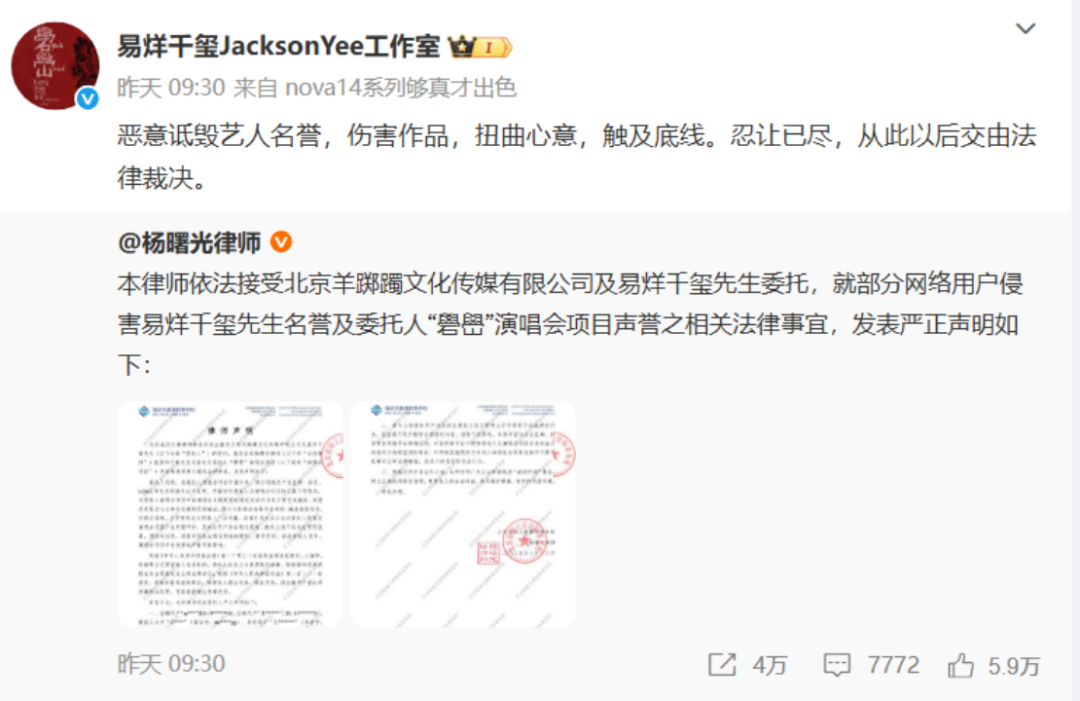 9月16日,北京海润天睿律师事务所杨曙光律师受易烊千玺及关联公司“北京羊踯躅文化传媒有限公司”委托发布正式声明。声明提到,自易烊千玺“礐嶨”演唱会开票以来,部分网络用户在网络平台上发布、传播针对演唱会的不实信息,对演唱会项目中的正常艺术编排、表现形式等进行无事实依据的恶意解读,强行与封建迷信等内容关联,编造虚假信息并广泛传播,甚至借此引流牟利,这些行为造成了易烊千玺名誉、演唱会项目声誉损害的严重负面影响,已对相关侵权用户提起民事诉讼。工作室随后转发强调,恶意诋毁触及底线,交由法律裁决。