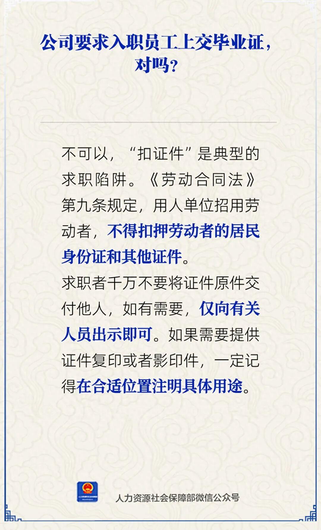 公司要求入职员工上交毕业证,对吗?人社部9月18日通过官方微信公众号作出解答。