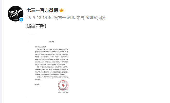 9月18日,电影《731》正式上映。同日,其官方账号发布郑重声明,具体如下: