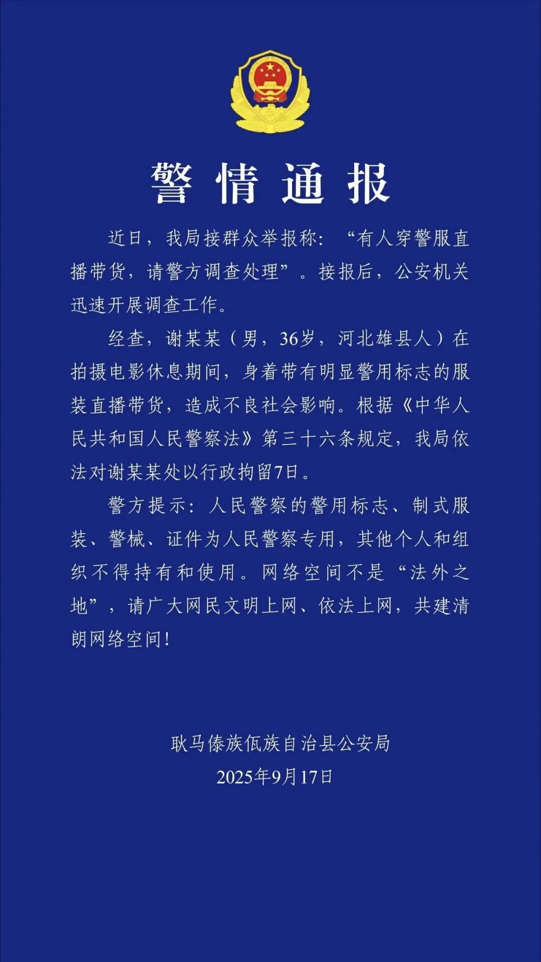 9月17日,云南耿马县公安局发布警情通报称,依法对其处以行政拘留7日。