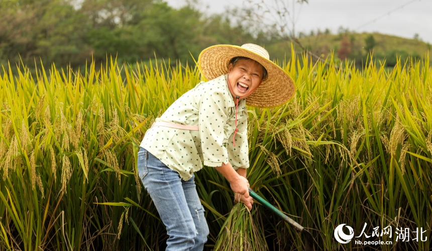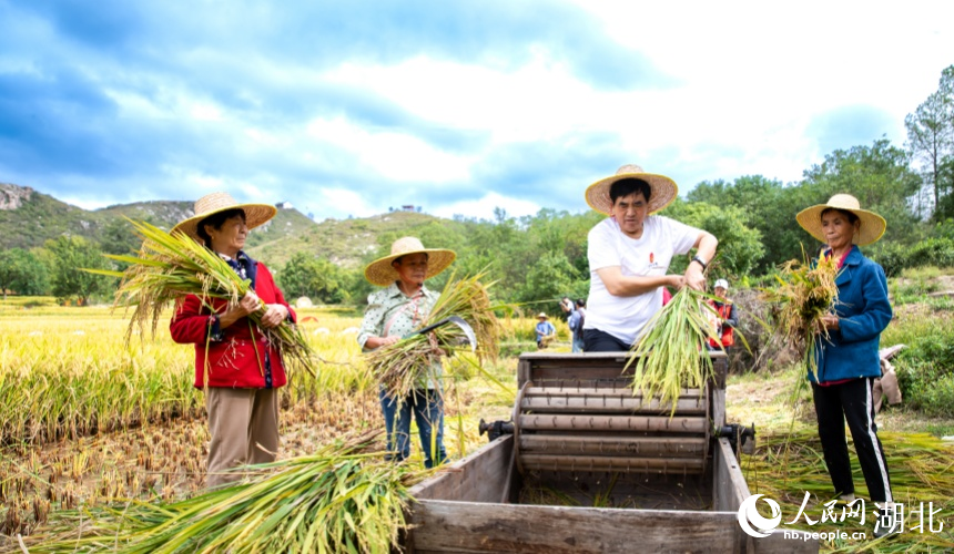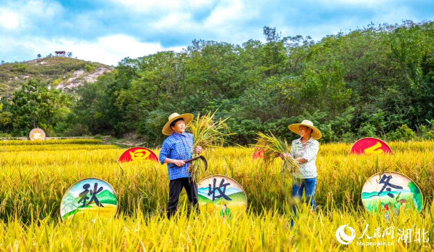 广袤的金色稻田随风起伏,村民忙着秋收。人民网记者 郭婷婷摄