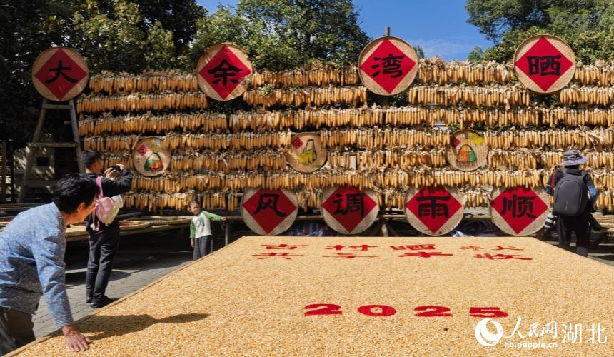 广袤的金色稻田随风起伏,古民居群错落其间,武汉黄陂区滠水河畔的大余湾迎来一年一度的“晒秋”盛景。9月20日,这座有六百余年历史的中国历史文化名村以金黄稻浪为背景,用火红的辣椒、棕褐的板栗和成串的玉米“绘”出一幅绚烂的丰收图景,吸引众多市民游客前来体验传统农俗与现代文旅交融的独特魅力。走在村中的石板巷间,随处可见圆簸箕铺满农产品、晒秋台缀满五谷杂粮。游客们手持稻穗、南瓜,在古民居群和田间地头拍照打卡,丰收在这里变得可以触摸。除传统民俗展示外,变脸喷火、皮影戏、编钟演奏等民间艺术轮番上演,为游客带来沉浸式体验。 大余湾村民笑容满面,体验丰收的喜悦。人民网记者 郭婷婷摄