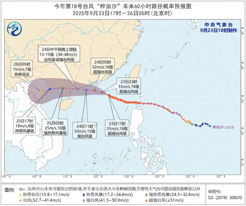 据中央气象台23日18时发布的消息,台风“桦加沙”预计24日中午到晚上登陆广东。(图源:中央气象台)