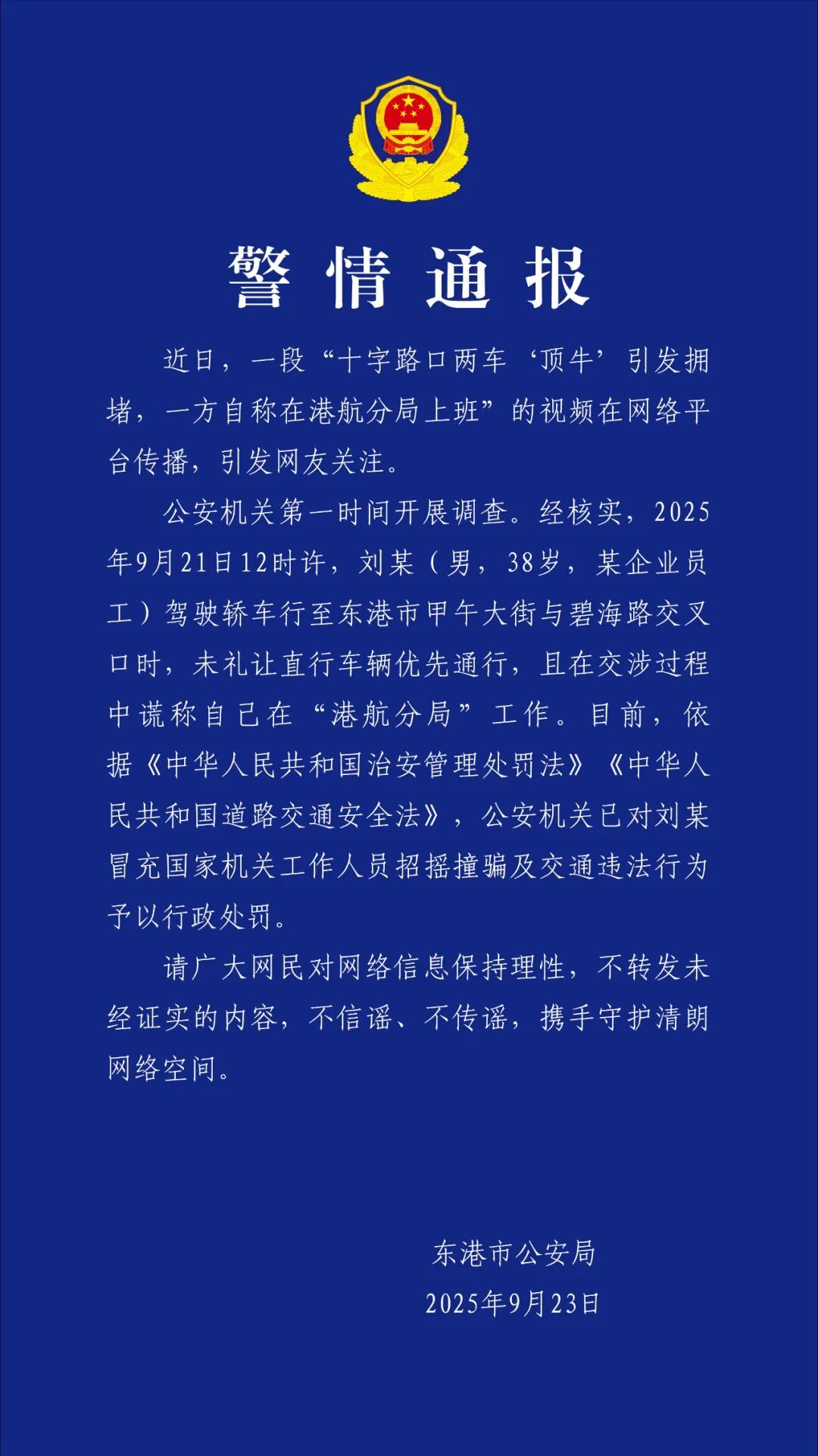 9月23日,东港市公安局发布警情通报: