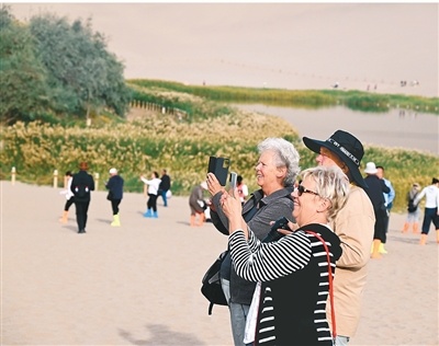 外国游客在甘肃省鸣沙山月牙泉景区游览拍照。张晓亮摄(人民图片)