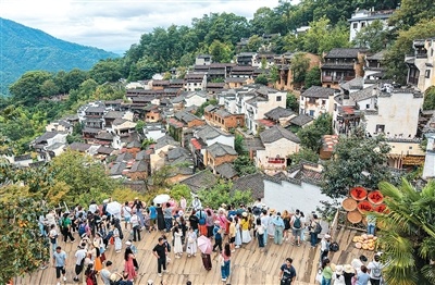 江西省婺源县篁岭村“晒秋”美景,吸引众多游客前来游览。胡敦煌摄(人民图片)