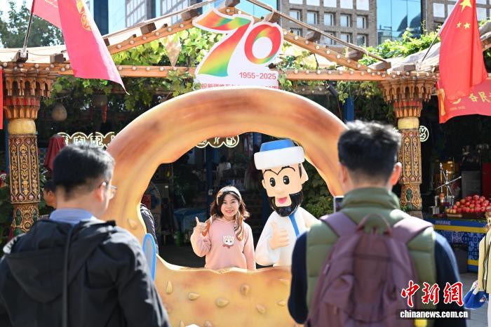9月23日,游客在新疆乌鲁木齐市大巴扎步行街打卡拍照。 中新社记者 田雨昊 摄