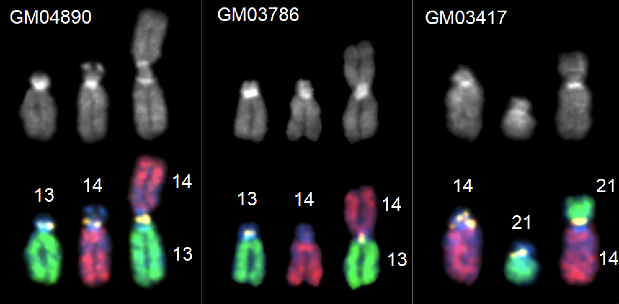 进一步分析显示,第14号染色体的SST1呈反向排列,使其能够与13号或21号染色体融合,形成稳定的新结构。无论哪种情况,生成的罗伯逊易位染色体几乎都携带原始染色体的全部遗传信息。