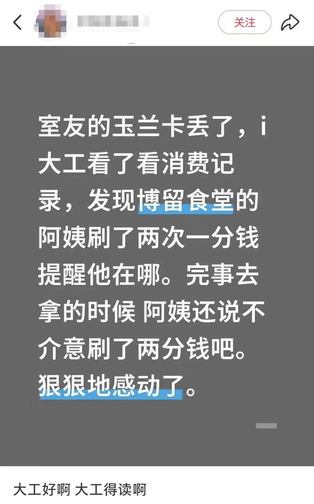 原来,是食堂阿姨在捡到卡后,通过刷极小金额的方式留下消费记录,用这种巧妙的方式提醒同学卡片所在的位置 。