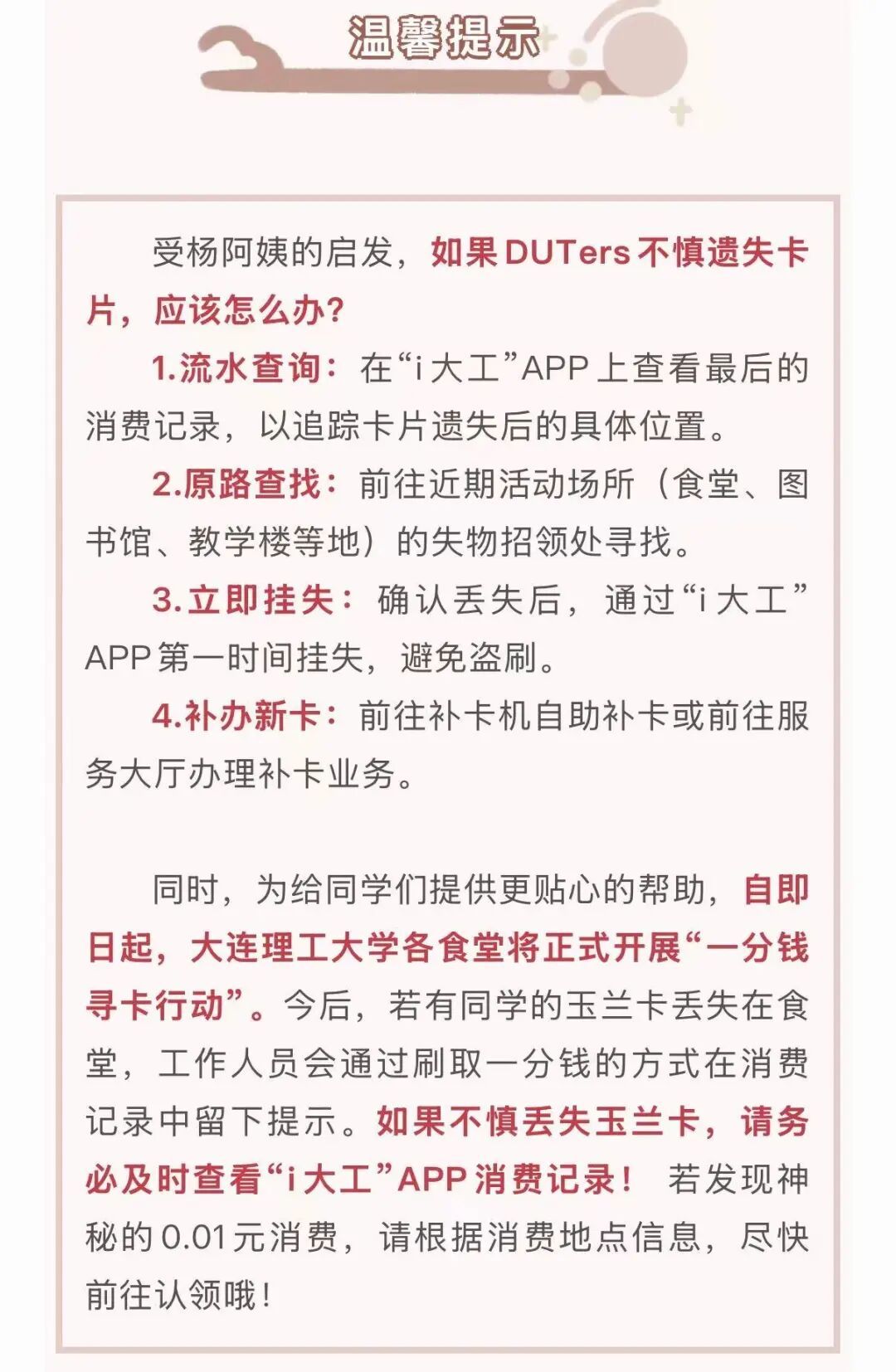自即日起,大连理工大学各食堂将正式开展“一分钱寻卡行动 ”。今后,若有同学的玉兰卡丢失在食堂,工作人员会通过刷取一分钱的方式在消费记录中留下提示。