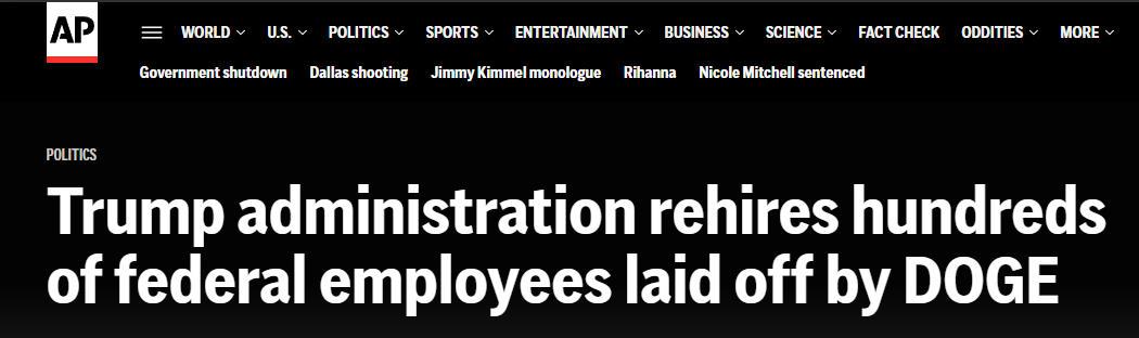 △美联社:特朗普政府将此前被“政府效率部”裁员的数百名联邦雇员又雇了回来