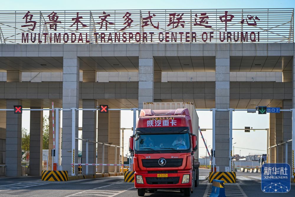 ↑9月15日,一辆货车驶入位于新疆乌鲁木齐国际陆港区的乌鲁木齐多式联运中心。新华社记者 辛悦卫 摄