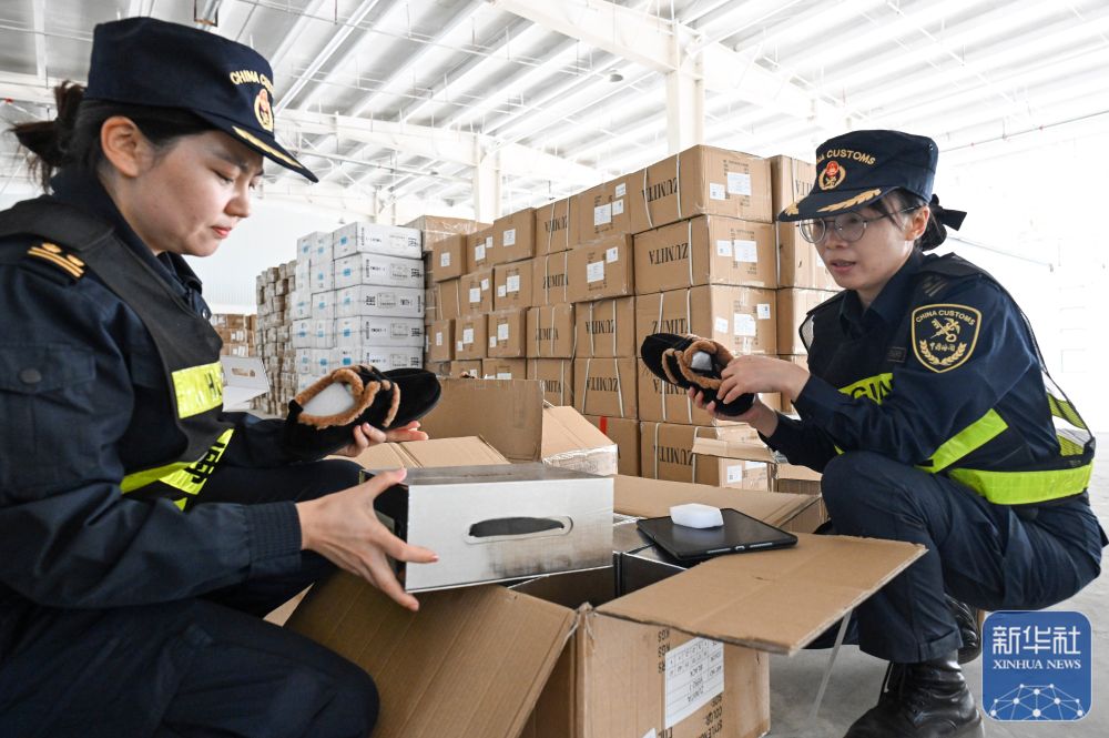 ↑9月17日,新疆塔城海关工作人员在巴克图口岸集中查验区检查一批经由该口岸运往哈萨克斯坦的鞋品。新华社记者 王菲 摄