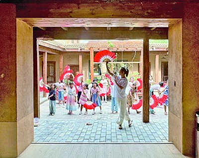 新疆库车市龟兹小巷的非遗工坊里,暑期支教大学生正在教孩子们跳中国舞。本报记者孙金行摄