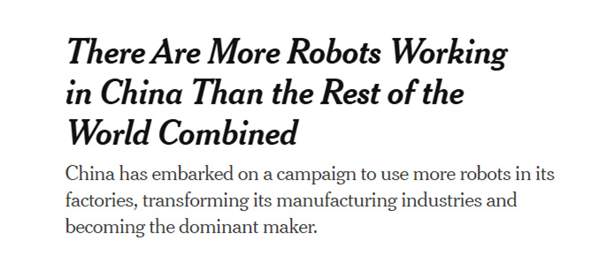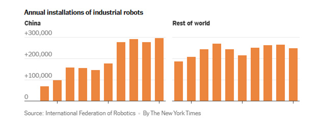报道称,就工业机器人而言,中国拥有众多优势。中国有大量能安装机器人的熟练电工和专业计算机程序员。此外,中国的人工智能行业高度聚焦于运用这项新技术来追踪和优化工厂设备性能的各个环节。