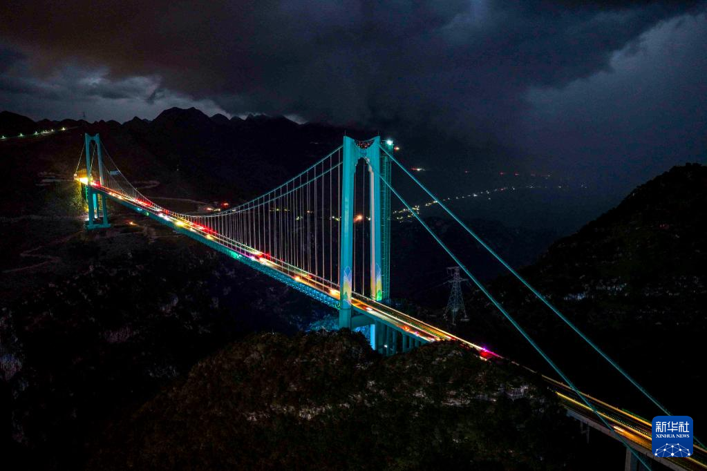 9月27日拍摄的夜幕下的贵州花江峡谷大桥(无人机照片)。 新华社记者 欧东衢 摄