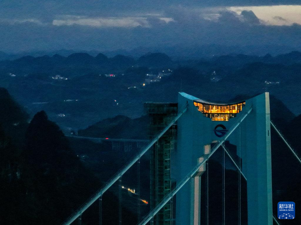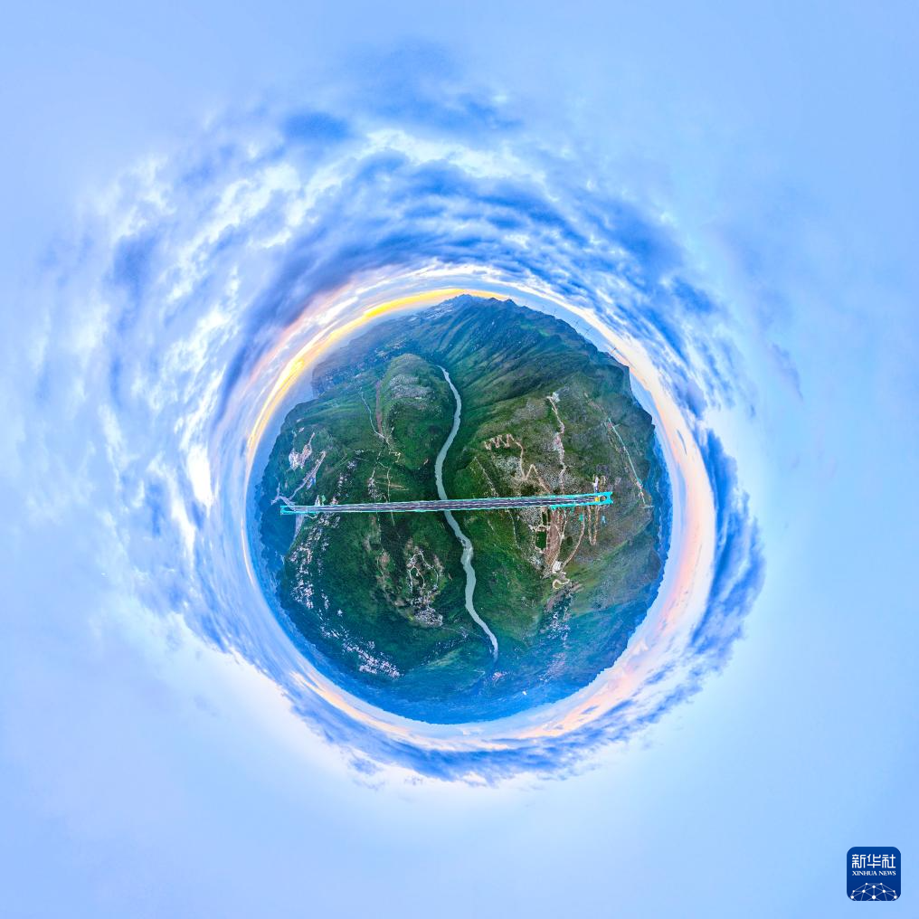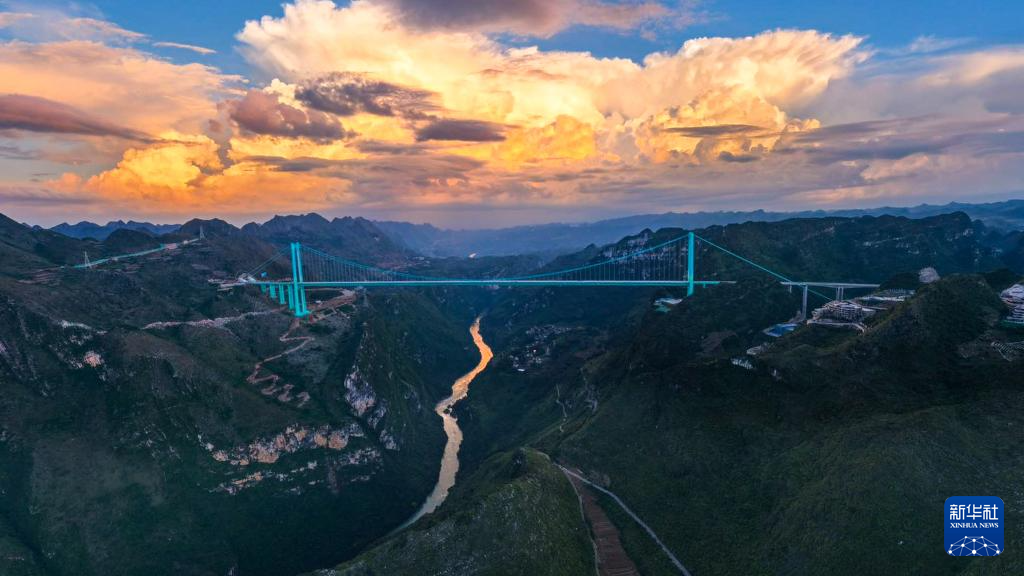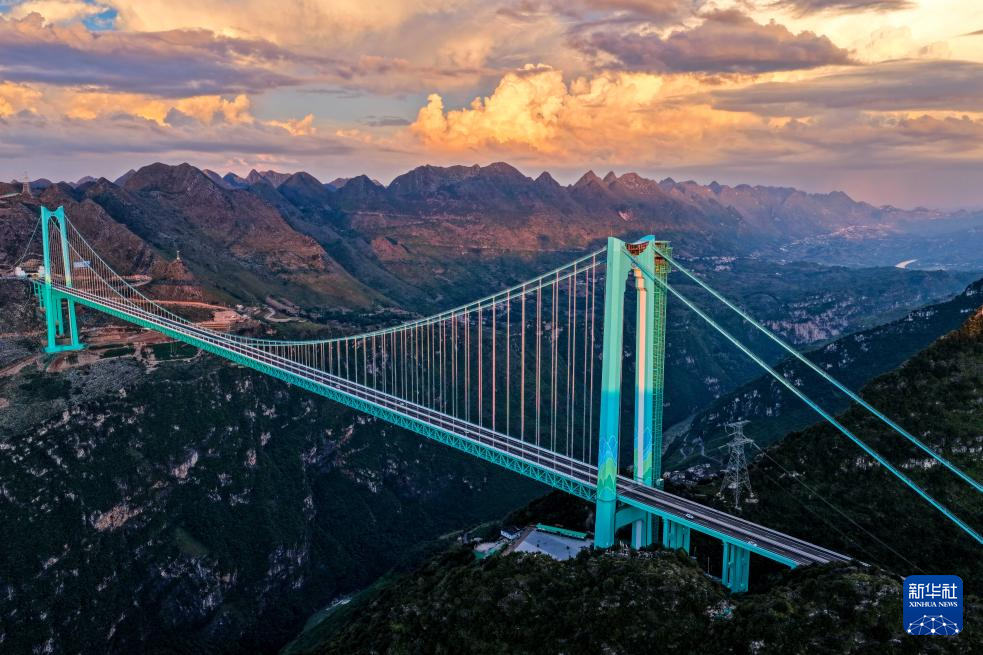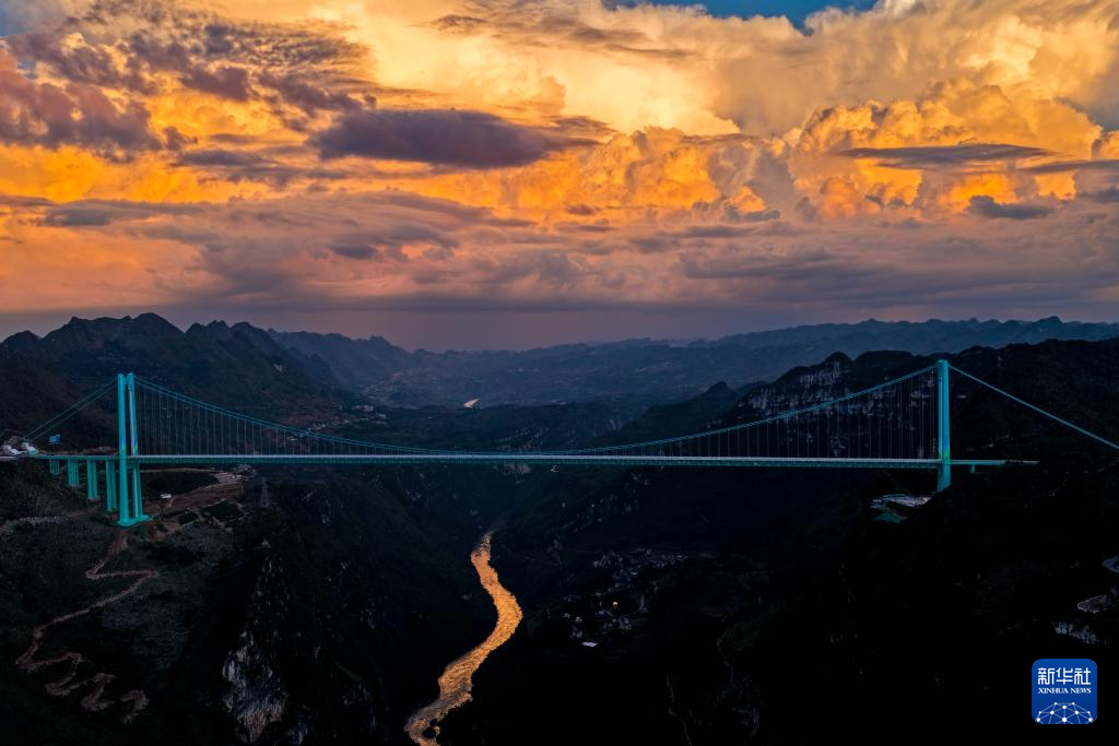 9月28日拍摄的夕阳下的贵州花江峡谷大桥(无人机照片)。 经过三年多建设,新的世界第一高桥——贵州花江峡谷大桥于9月28日正式建成通车。 花江峡谷大桥是贵州六枝至安龙高速公路的控制性工程,大桥全长2890米,主跨1420米,是目前世界山区峡谷第一大跨度钢桁梁悬索桥;其桥面距水面垂直高度625米,超越北盘江第一桥成为新的世界第一高桥,被誉为“横竖都是第一”。在不同时段的光线下,世界第一高桥呈现出不同的美景。 新华社记者 杨文斌 摄