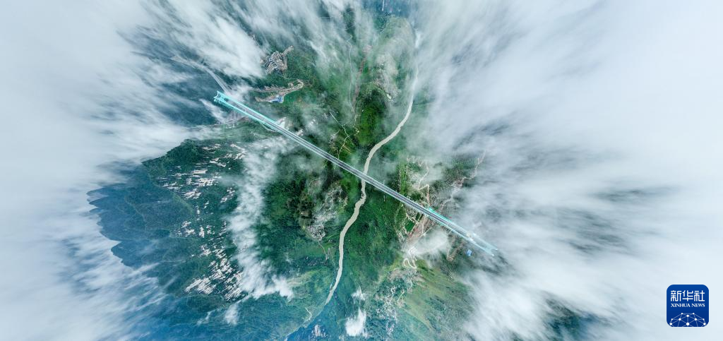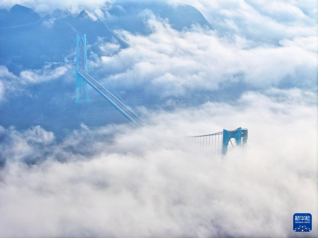 9月27日拍摄的云雾中的贵州花江峡谷大桥(无人机照片)。 新华社记者 欧东衢 摄