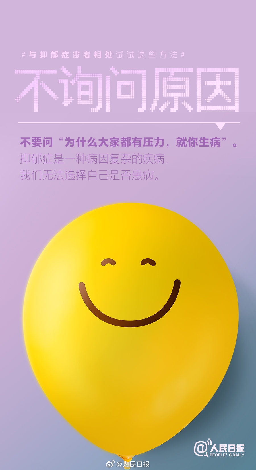 抑郁症≠抑郁情绪,不是仅靠自我振奋就能好转的。多理解倾听、多关心配合、不盲目建议、不指责……今天是世界精神卫生日,一起了解。