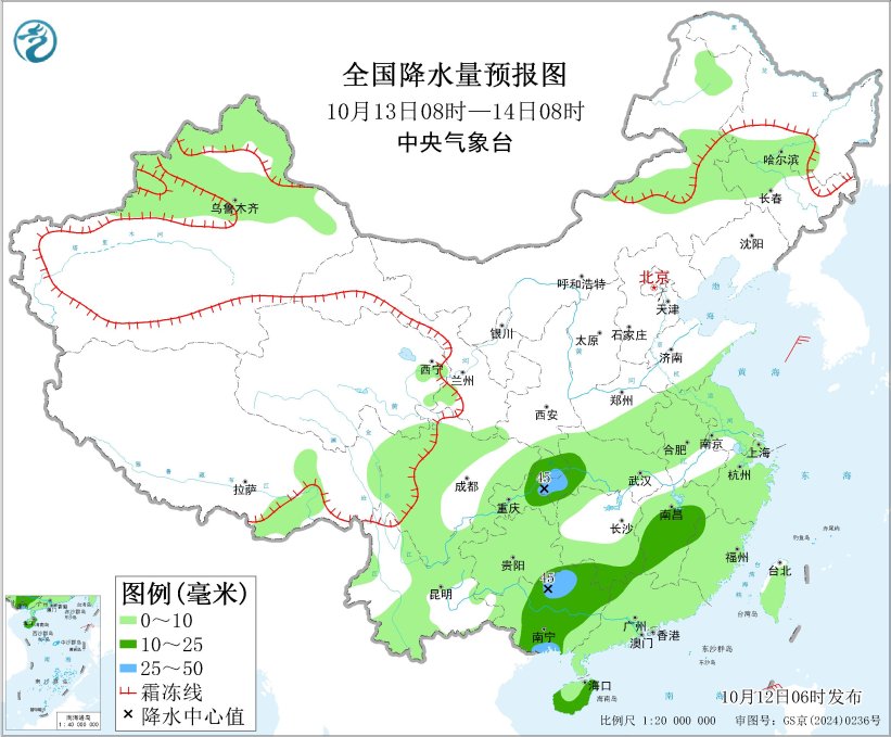 10月13日08时至14日08时,新疆北部、内蒙古东部、黑龙江西南部、吉林西部、西南地区东部和南部、黄淮南部、江淮、江汉、江南大部、华南等地的部分地区有小到中雨或雨夹雪天气,其中,湖北西南部、重庆东北部、广西北部和南部沿海等地部分地区有大雨(25~45毫米),黄海中部和南部海域有4~6级风,阵风7级。