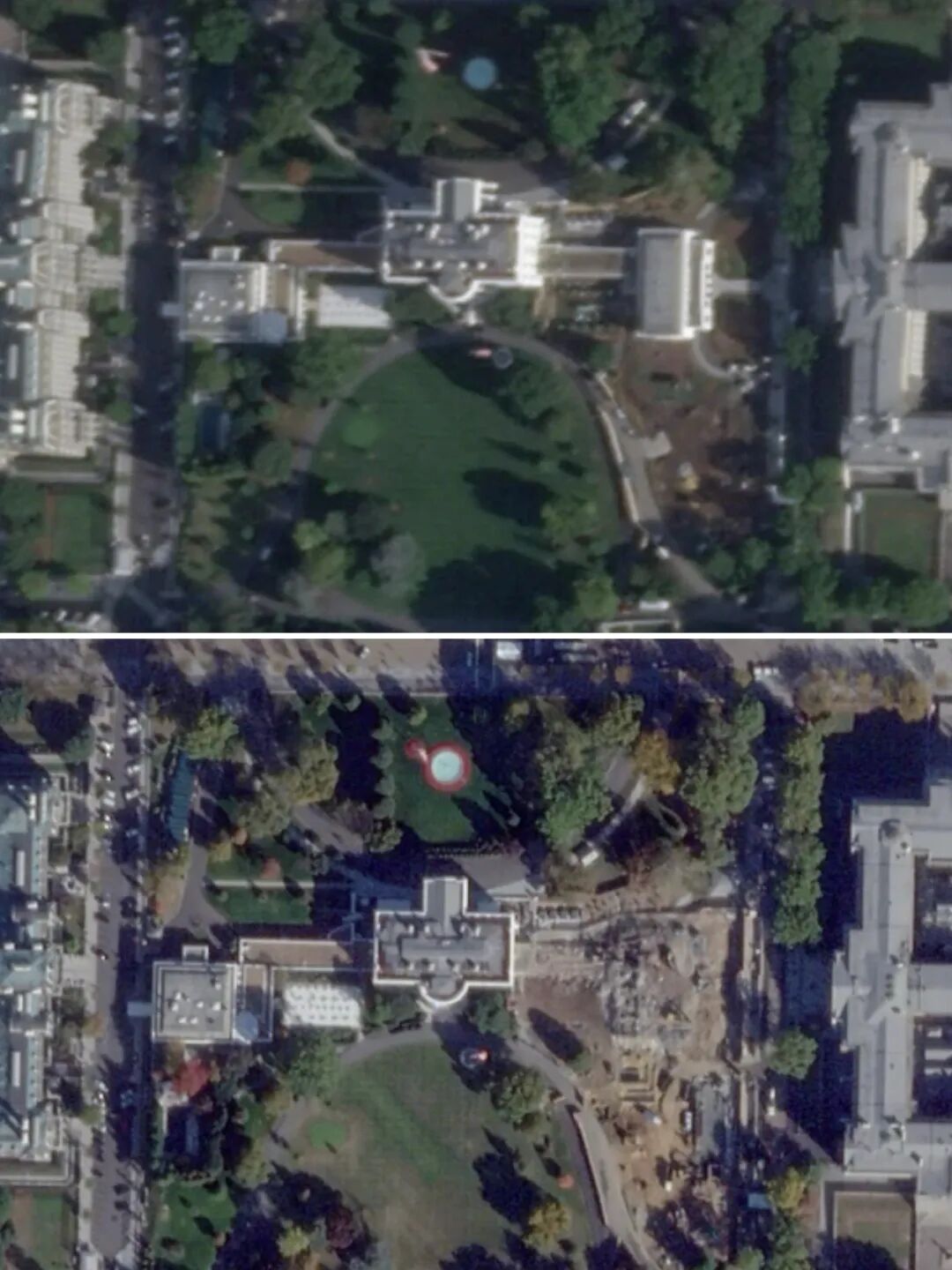 △美国白宫9月26日(上)与10月23日(下)的卫星照片对比。
