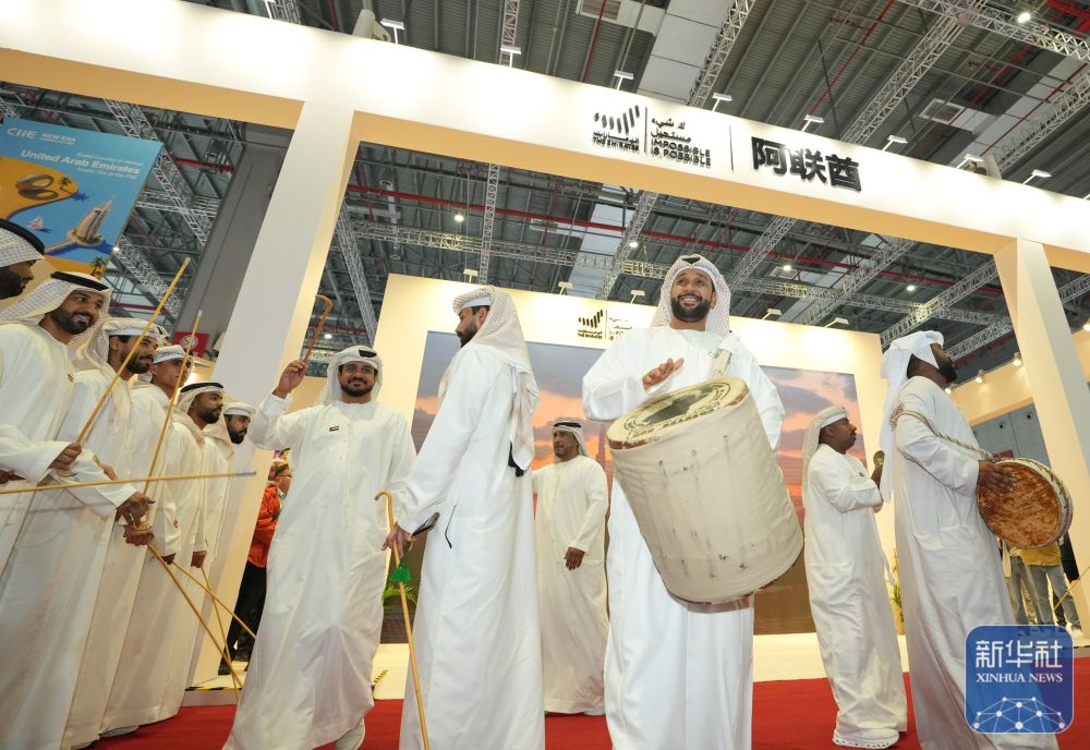 ↑ 11月7日,工作人员在第八届进博会国家展阿联酋馆表演。新华社记者 任鹏飞 摄