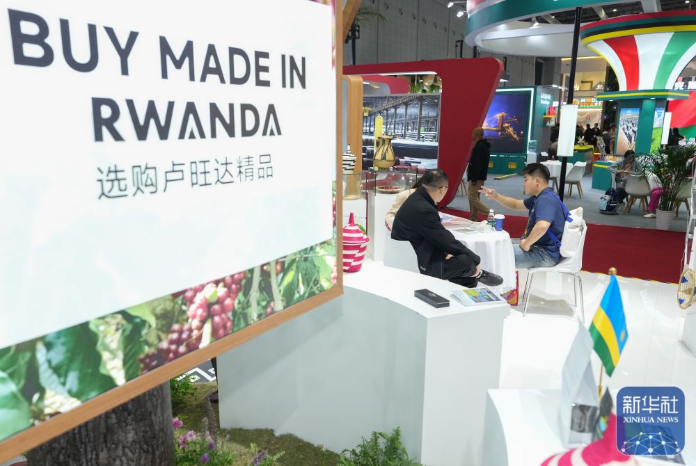 ↑ 11月7日,人们在第八届进博会国家展卢旺达馆洽谈。新华社记者 任鹏飞 摄