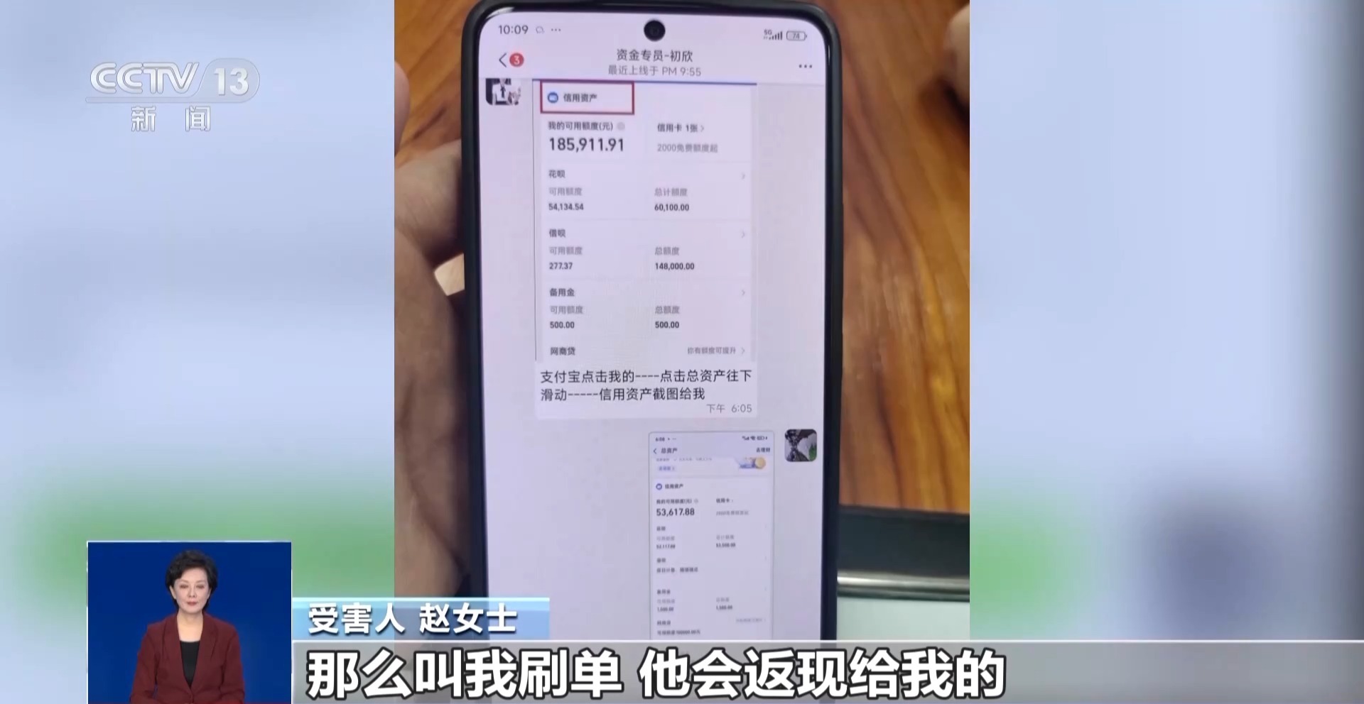 受害人赵女士:他说他的软件是工商里面他已经备注的,里面的群聊什么东西都是比较安全,叫我放心,叫我刷单,他会返现给我的,所以我刷了一段时间,他返给了我50块钱,里面还有客服提示我,叫我继续再刷。因为他已经50块返给我,我相信他,我有点贪小便宜嘛,这种事情我以前也没有碰到过,所以我一直刷刷刷。