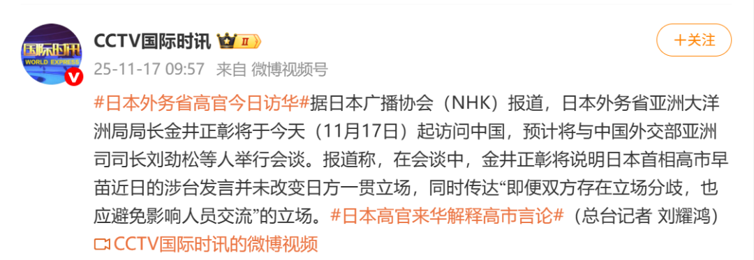 据日本广播协会(NHK)报道,日本外务省亚洲大洋洲局局长金井正彰将于今天(11月17日)起访问中国,预计将与中国外交部亚洲司司长刘劲松等人举行会谈。报道称,在会谈中,金井正彰将说明日本首相高市早苗近日的涉台发言并未改变日方一贯立场,同时传达“即便双方存在立场分歧,也应避免影响人员交流”的立场。