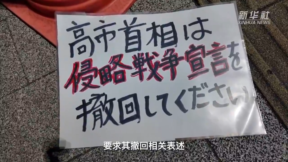 集会定于当地时间20时开始。19时前后,便有民众陆续赶到现场。抗议者们举着写有“撤回言论 反对战争”“因高市才有事”“高市下台”等标语的牌子,高喊“禁止军国主义复燃”等口号。多名抗议者要求高市对其涉台言论负责并辞去首相职务。