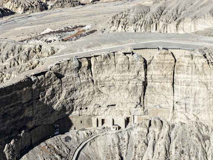 1987年,那时的东嘎石窟尚无人问津。甚至没有像样的路,阿旺米朗硬生生在陡峭的山体上走出了一条路。那会儿,石窟还有些渗水,他独自一人扛着塑料布从山的另一边绕上陡峭的山顶,在海拔4000多米的山顶为洞窟做防水措施;高原漫长的寒冬里,他能依靠的热源只有手中的酥油灯——但没过多久,他就发现酥油灯会熏黑墙壁,他便自己在石窟外搭了个简单的房屋。