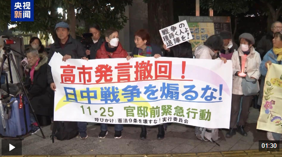 总台记者 李卫兵:25日晚,数百名日本民众聚集在日本首相官邸前,抗议日本首相高市早苗拒不撤回涉台错误言论,他们高声呼吁,不需要有可能将日本带入战争歧途的首相。