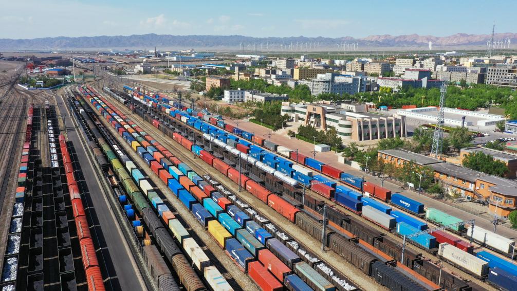 在新疆阿拉山口站宽准轨编组场,出入境中欧班列集结等待出发(2024年5月25日摄,无人机照片)。新华社发(于晖 摄)