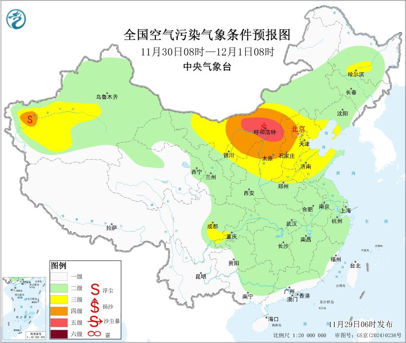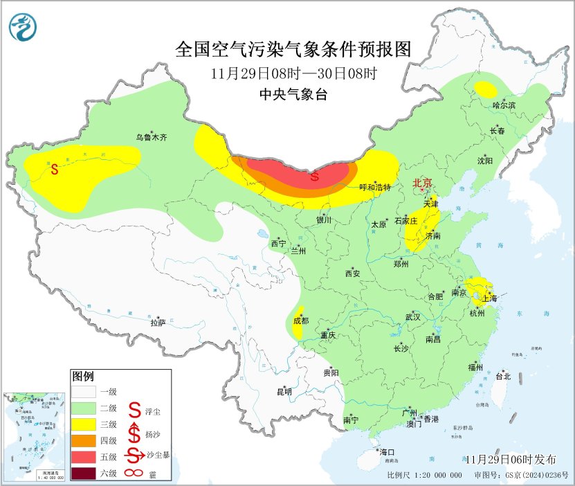 受冷空气大风影响,29日至30日,新疆东部和西南部、内蒙古中西部、甘肃西部偏北地区、宁夏中北部、陕西北部等地的部分地区自西向东先后有扬沙或浮尘天气,内蒙古西部局地有沙尘暴。