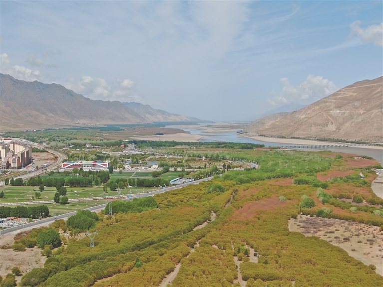 图为临近山南市区的雅鲁藏布江沿岸绿意葱茏的人造林(资料图片)。 记者 巴桑旺姆 摄