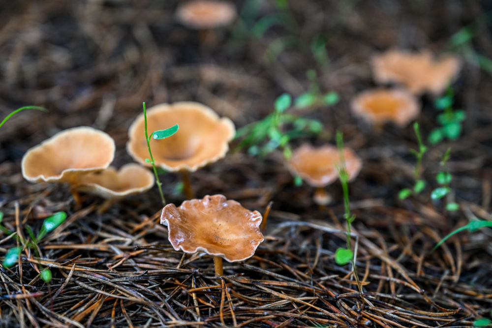 这是在内蒙古通辽市科尔沁左翼后旗的科尔沁沙地“双百万亩”综合治理工程努古斯台项目区内,樟子松林下生长的蘑菇(2024年8月3日摄)。新华社记者 连振 摄