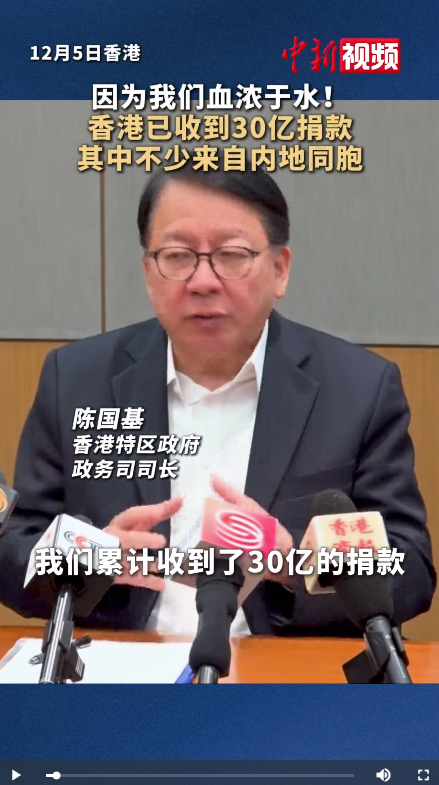 12月5日香港特区政府召开发布会,香港特区政府政务司司长陈国基表示,“我们累计收到了30亿的捐款,其中不少来自内地同胞。我要真诚地感谢内地同胞对香港灾民的支援,因为血浓于水。这真正体现了一方有难八方支援,让我们感到非常温暖”。