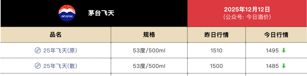 12月12日,第三方平台“今日酒价”数据显示,2025年53度500ml飞天茅台散瓶批发参考价已跌至1485元/瓶,原箱产品报价为1495元,均较前一日下跌15元,创历史新低。