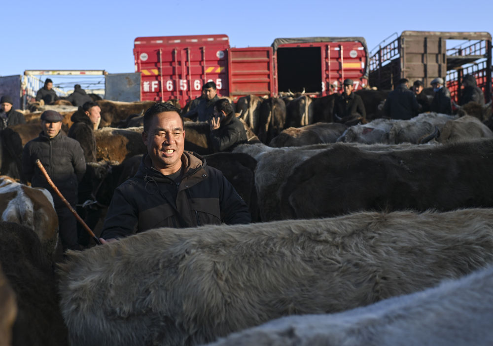 马军在新疆创锦黄公农产品交易市场为客户挑选牛。