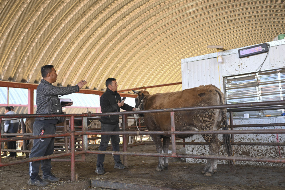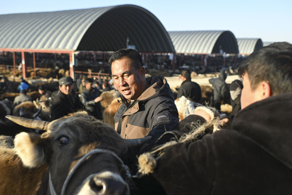 牲畜经纪人马军(中)带着来自青海的客户(左)在新疆创锦黄公农产品交易市场上选购牛。