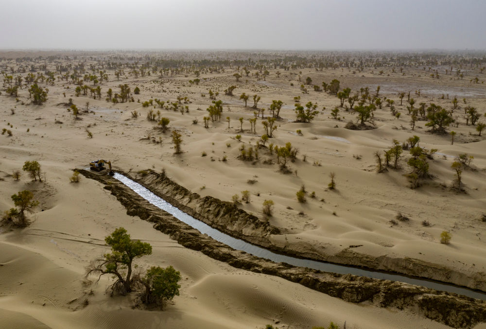 2025年9月19日,新疆巴音郭楞蒙古自治州尉犁县国有林管理局护林员艾力·尼亚孜(右)和同事沿着人工开挖的引洪补水生态渠巡视。